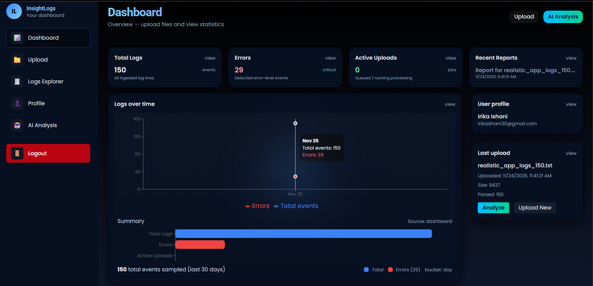 Developed a full-stack log analysis platform that combines fast backend processing with intelligent AI-powered insights. InsightLogs includes secure authentication (JWT + Firebase), a personalized dashboard, real-time log visualization, and advanced filtering tools for errors, warnings, and service-level analysis.